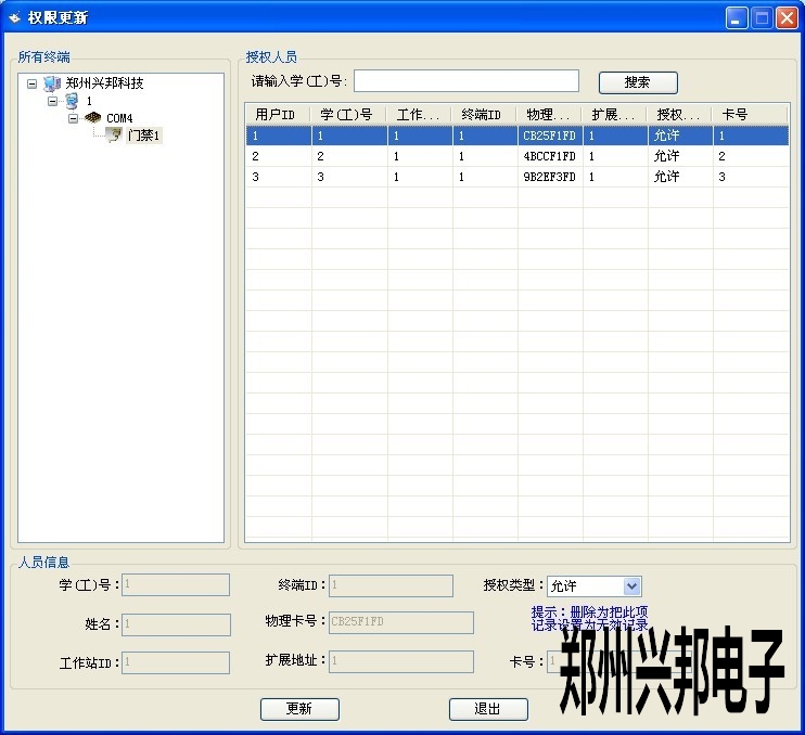 1.選擇終端,在右列表框中可顯示出該終端下的所有授權人員的名單?;蛘咴谡堓斎雽W(工)號右邊的文本框中錄入所要更改權限的學工號,單擊搜索按鈕可在列表中查詢出該人員的授權信息。