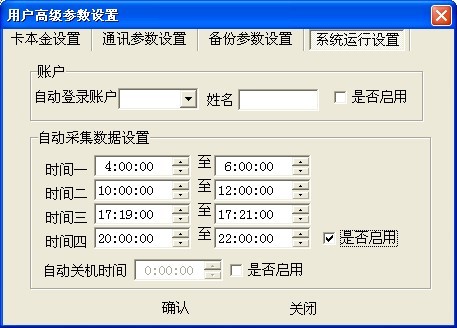 485一卡通軟件可以設(shè)置消費(fèi)數(shù)據(jù)定時(shí)采集,如下圖所示,在用戶高級參數(shù)設(shè)置-系統(tǒng)運(yùn)行設(shè)置中有一個自動采集數(shù)據(jù)設(shè)置,最多可以設(shè)置四個自動采集的時(shí)間段,時(shí)間段設(shè)置時(shí)不能跨天,且后一個時(shí)間段的開始時(shí)間不能大于前一時(shí)間段的結(jié)束時(shí)間,設(shè)置完成后勾選上是否啟用,點(diǎn)擊確認(rèn)即可,如果沒有勾選上是否啟用,代表自動采集數(shù)據(jù)設(shè)置不起作用。