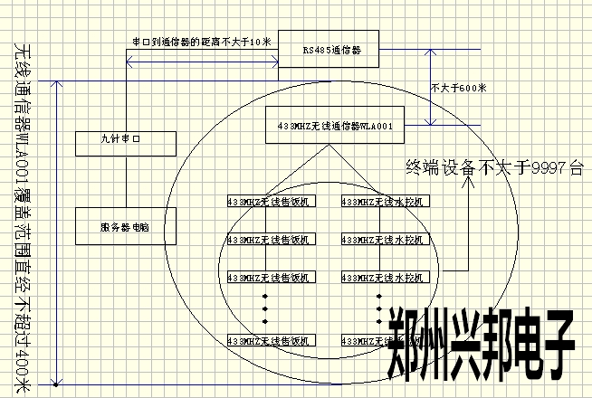 433MHZ無線通信器(WLA001)使用框圖如下所示,一個433MHZ無線通信器(WLA001)的無線覆蓋范圍為直經(jīng)400米(空曠地區(qū));只要在收發(fā)的范圍內(nèi),可連接的終端設備的臺數(shù)理論上沒有限制;地址號9998、9999,終端設備不可用,系統(tǒng)使用;