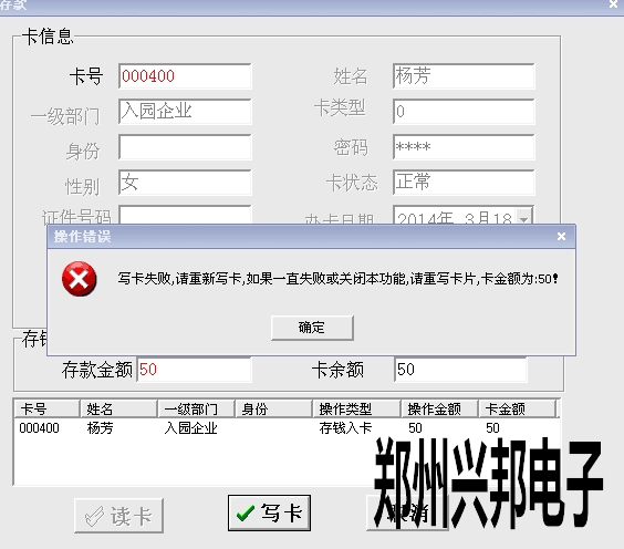 客戶在使用我們的局域網(wǎng)一卡通存款時出現(xiàn):寫卡失敗,請重新寫卡,如果一直失敗或關閉本功能,請重寫卡片,卡金額為50!
