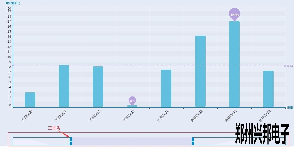 這是一個(gè)柱狀的數(shù)據(jù)圖表,展示了各個(gè)終端在所查詢時(shí)間內(nèi)的營業(yè)情況,那么最下面的那條橫杠是什么呢?其實(shí)那是一個(gè)工具條,用來集中顯示某個(gè)具體的柱狀數(shù)據(jù),如水控機(jī)409以及后面的幾個(gè)數(shù)據(jù)都看不大清楚,想要拉近一點(diǎn)看看,怎么做呢,很簡單,只要拉動(dòng)最下面的工具條就好了,就像這樣: