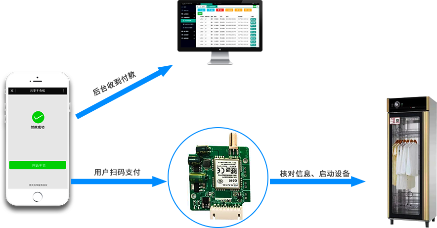 共享干衣機采用無人經(jīng)營模式,用戶使用掃碼支付使用,運營商則借助云管理平臺實現(xiàn)遠(yuǎn)程管理。